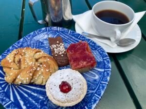 hänförande utsikt ut mot Norasjön och Alntorps ö. Vi gör som de flesta och njuter av klassikern ”kaffe med brödportion”. En riklig kanna gott kaffe tillsammans med minst tre sorters hembakat. Fika som bäst.