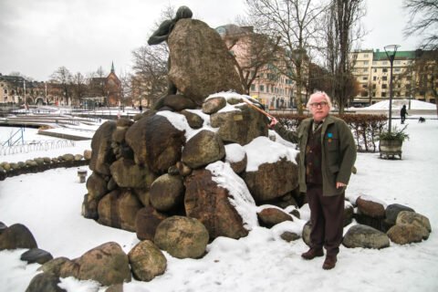 – Vi står framför Besudlaren i Henrik Allards Park. Här står han och snuskar sig med en sten och det framför vårt vackra slott, som…
